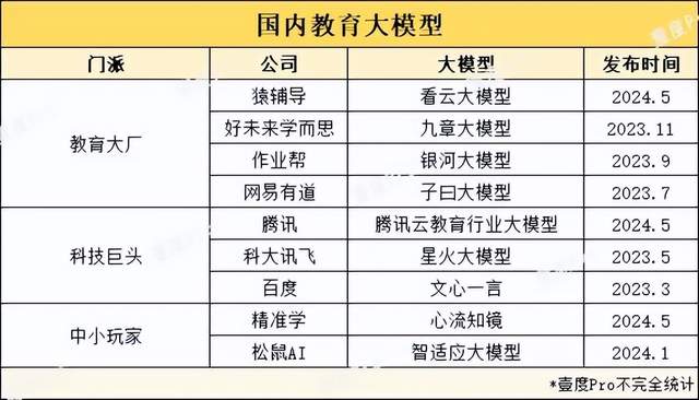 事实上,自去年3月大模型横空出世以后,教育大模型的牌桌上已经集齐了以猿辅导为代表的教育大厂、以科大讯飞和百度为代表的科技巨头,以及以精准学为代表的中小玩家这“三大门派”。