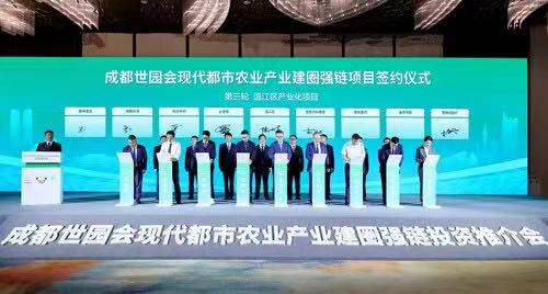 6月12日,由成都市农业农村局、成都市投资促进局、成都市温江区人民政府主办的成都世园会现代都市农业产业建圈强链投资推介会在温江区举行。现场22个项目集中签约,计划总投资约102亿元,其中温江区签约项目16个,计划总投资约90亿元。