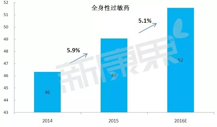 据中康CMH监测数据显示,2015年我国全身性过敏药总体规模(按照五大终端价计算,下同)为49亿元,较2014年增长5.9%。预计2016年总体规模市场增长5.1%,规模将会达到52亿元。