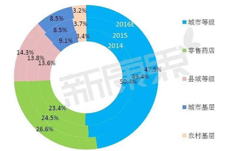图2 2014-2016E年全身性过敏药用药渠道销售占比