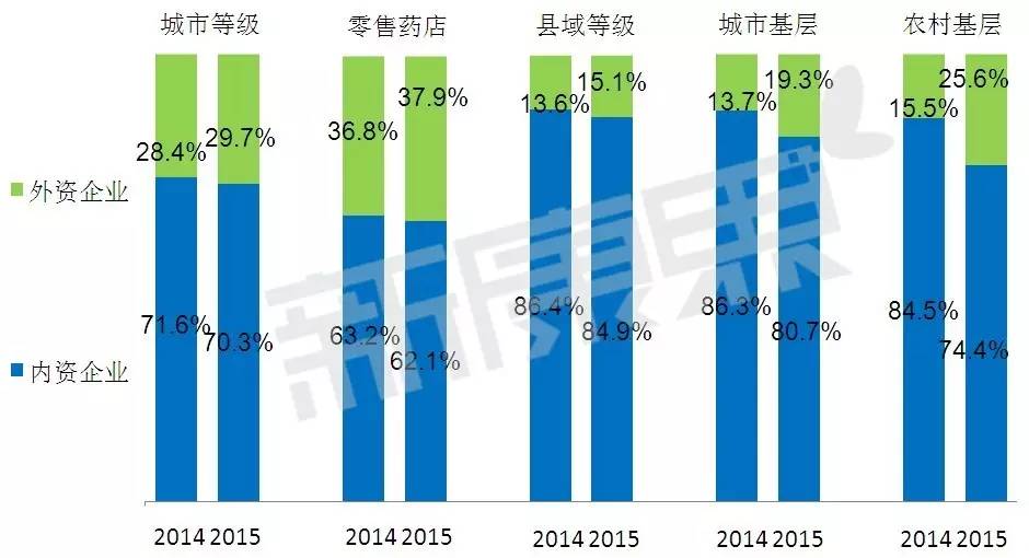 图3 2014-2015年全身性过敏药用药五大终端市场内外资企业销售占比