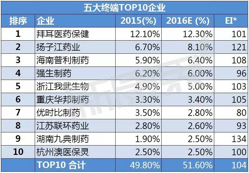 图4 2015-2016E年全身性过敏药用药五大终端top10企业销售份额占比