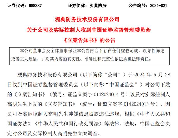 观典防务公告显示,因公司涉嫌信息披露违法违规,根据《中华人民共和国证券法》《中华人民共和国行政处罚法》等法律法规,证监会决定对公司及实际控制人高明先生立案调查。