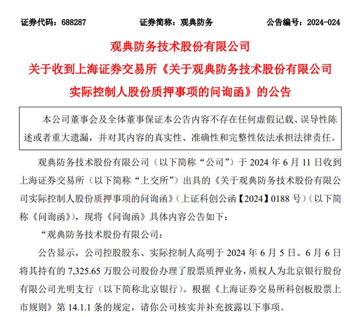 2024年6月12日,观典防务公告称收到上交所问询函,起因是实控人高明为了给违规担保提供增信,质押了其所持半数公司股份。