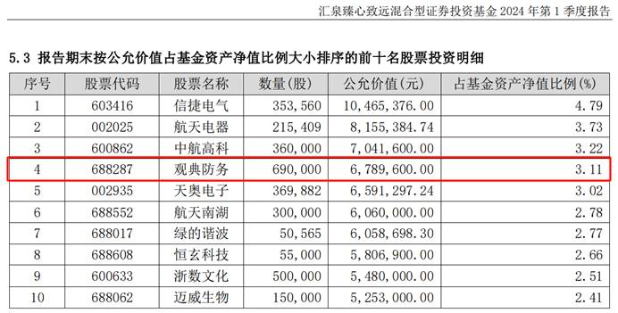 2024年一季报显示,汇泉基金旗下产品汇泉臻心致远混合新进观典防务69万股,占基金净值比达到3.11%,观典防务为其第四大重仓股。