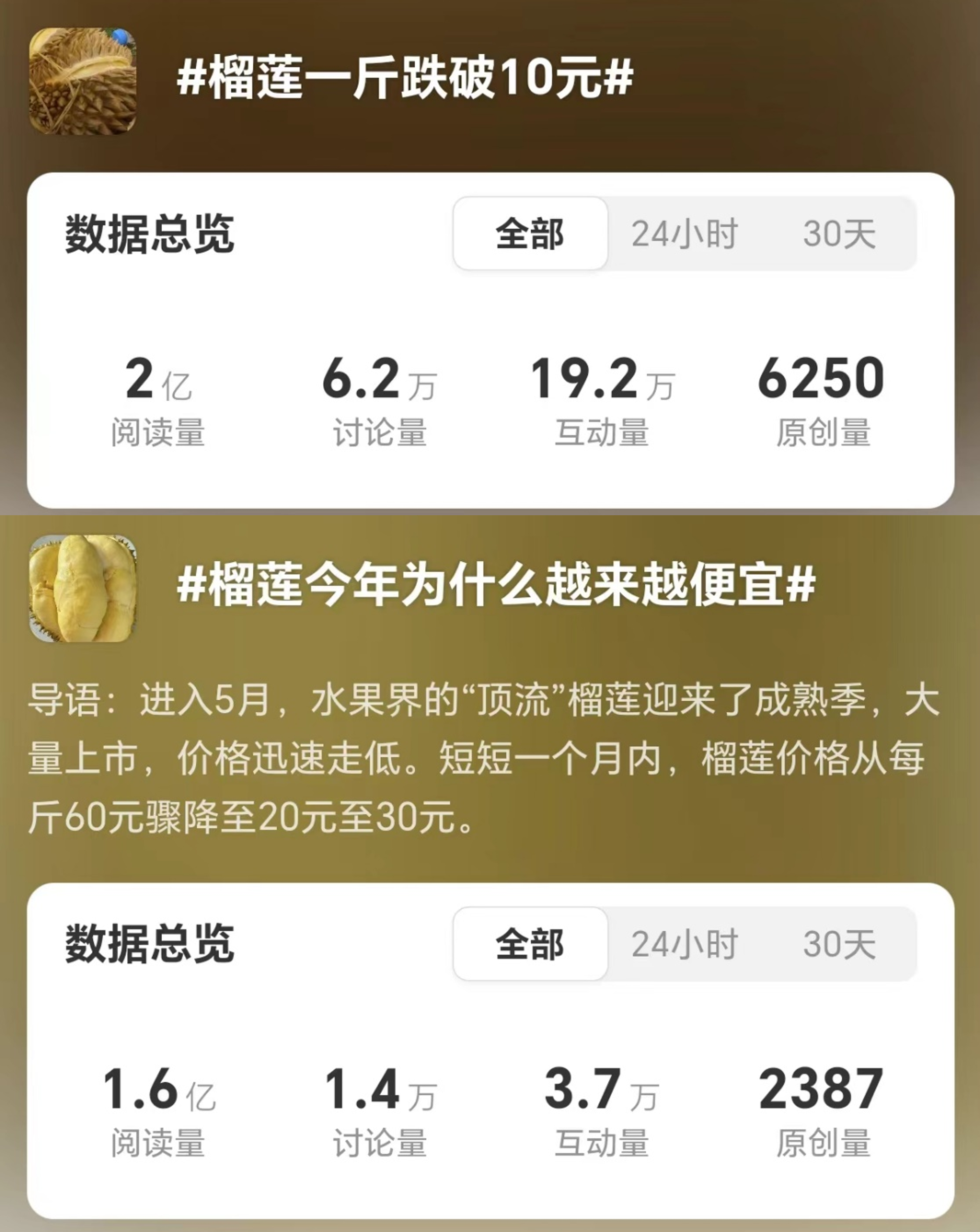 那么问题来了,既然榴莲每年都销售火热,为何今年就是特别火?有人可能会说是因为低价。毕竟不久前榴莲频上热搜的关键词便是降价,多个话题阅读量均过亿,仿佛榴莲自由的盛景近在眼前。