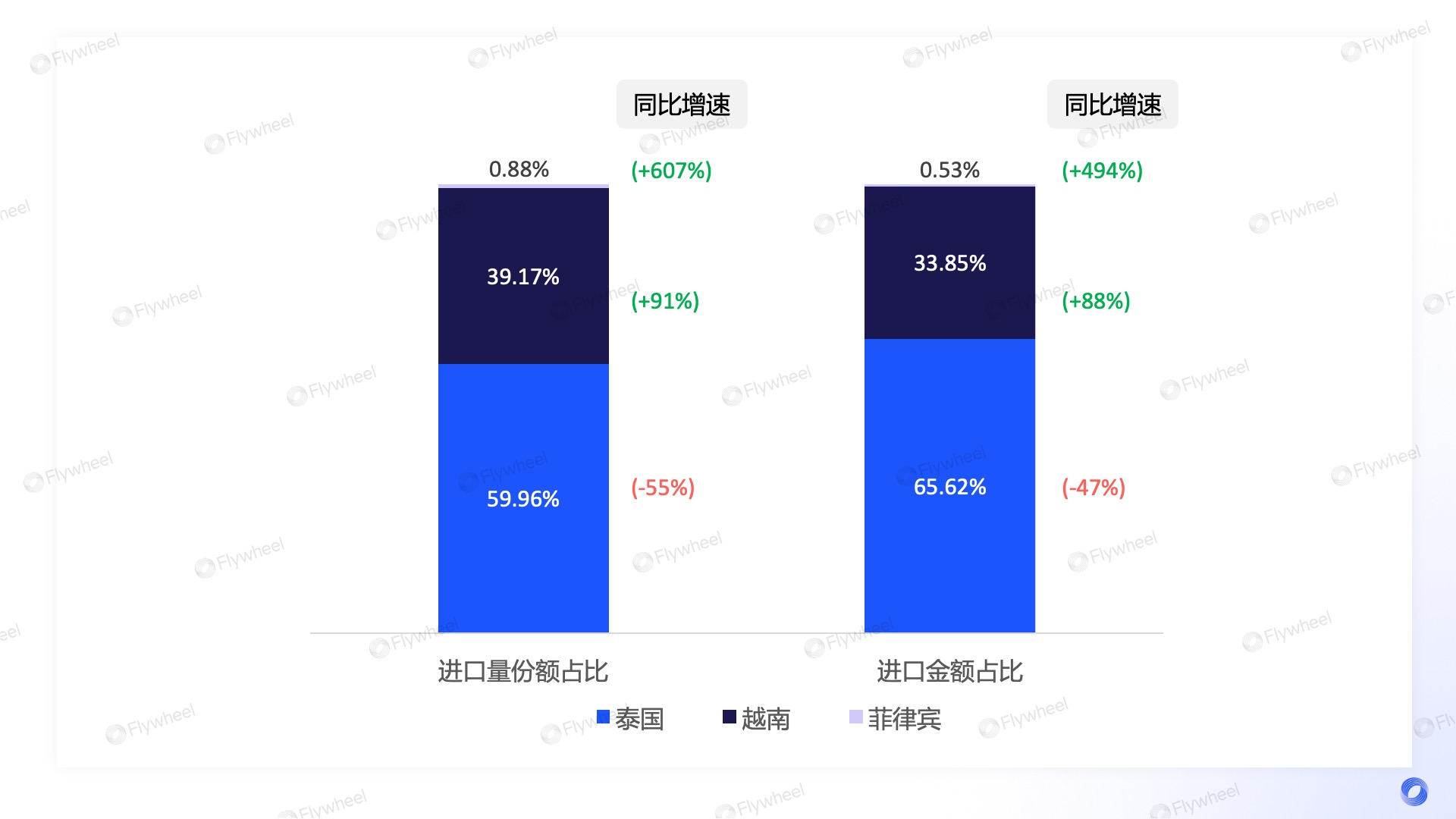 但由于越南、菲律宾的鲜榴莲在22年下半年、23年初先后获准进入中国市场,如今中国对泰国榴莲的依赖程度大大降低,去年同期泰国榴莲进口量份额占比接近87%,今年便只有60%,而越南、菲律宾的同比增速分别达到了91%、607%。