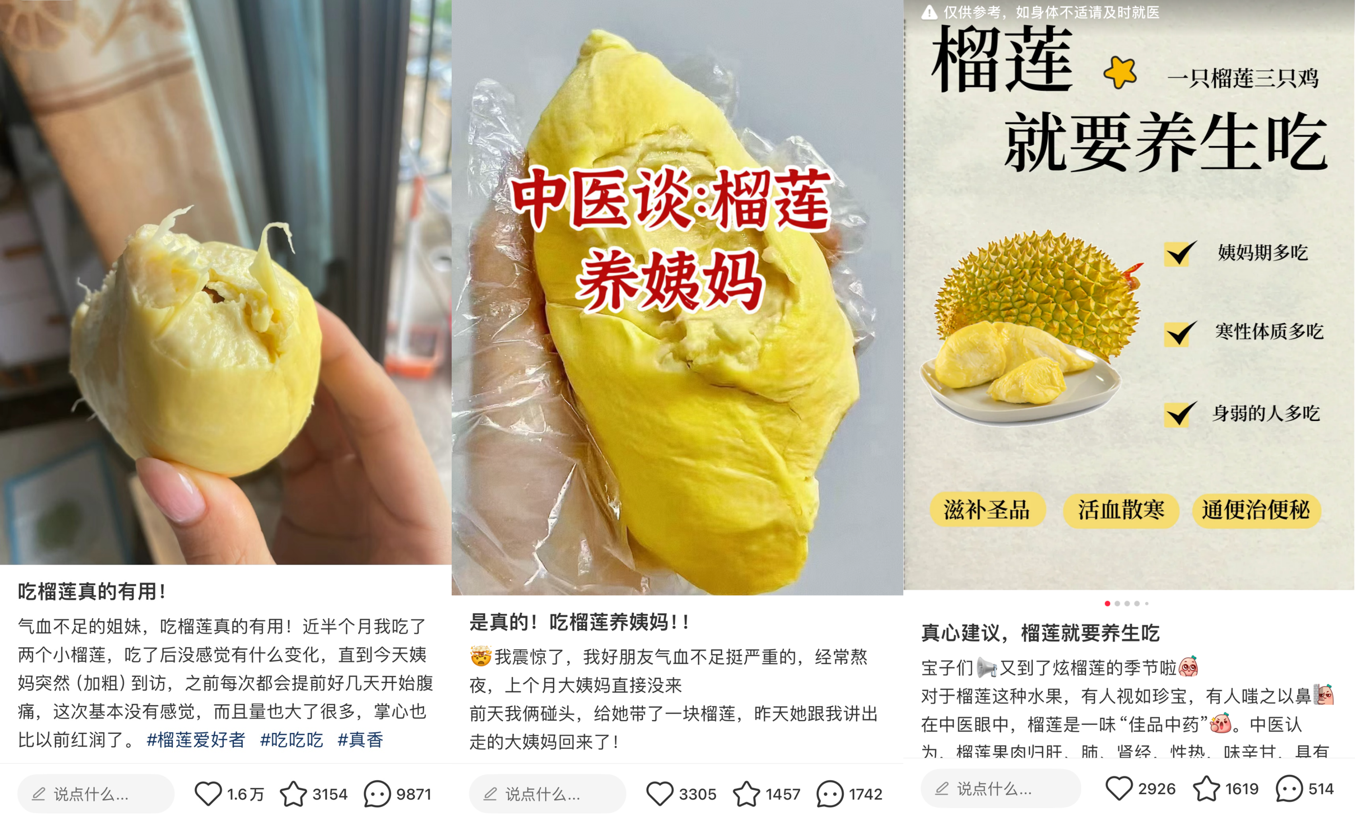 除了各类玩梗,社媒上针对榴莲的功效科普,也逐渐从单纯宣传营养价值高,走向了更细化的补气血、防痛经、美容养颜等功能场景宣称,拿捏住了全民保健养生的心态。