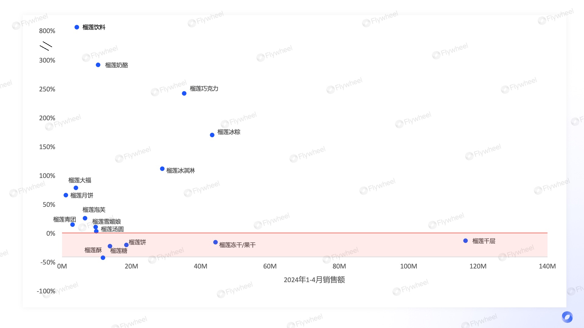 由此,我们分析了电商平台上,榴莲深加工产品的细分品类增速。