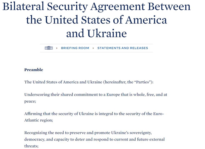 据白宫官网公布的协议内容,美国不仅将在乌克兰遭遇武装进攻威胁时提供协助,还将从海陆空全面协助乌克兰提升军事能力并协助其进行符合欧盟和北约标准的司法、税收等改革。