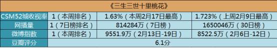 本周上榜的几部热播剧中,《三生三世十里桃花》可谓是最大赢家。收视率方面,CSM52城收视率最高为1.63%,居同时段电视剧收视榜首位;网播量方面,该剧近一周网络播放次数为814284万次,拔得榜单头筹;微博指数方面,该剧近7日内为9551.9万阅读人次,同样居排行榜首位。