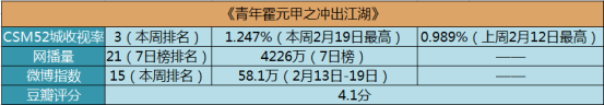 由寇振海、姚橹、巩汉林、午马、石兆棋等主演的传奇功夫剧《青年霍元甲之重出江湖》表现不俗,CSM52城收视率于2月19日达到最高值,为1.247%,稳居同时段电视剧收视榜第三位。近7日内,该剧累计网络播放量为4226万次,夺得榜单第二十一位。然而,其豆瓣评分依然处于低迷状态,仅为4.1分。