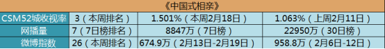 本周六(2月18日),东方卫视《中国式相亲》CSM52城收视率为1.501%,收视份额4.278%,跻身同时段综艺收视榜前三甲。近一周内,该节目累计播放量为8847万次,微博指数为674.9万阅读人次,微博指数方面稍有落后。
