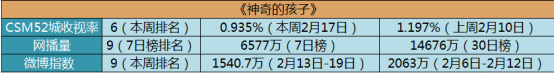 本周五(2月17日),湖南卫视《神奇的孩子》CSM52城收视率为0.935%,收视份额2.652%,位于排行榜第六位。近一周内,该节目累计播放量为6577万次,位于榜单第九位。