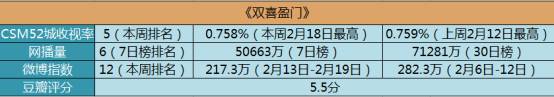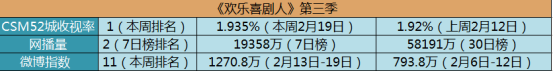 本周日(2月19日),东方卫视《欢乐喜剧人》第三季CSM52城收视率为1.935%,收视份额6.796%,拔得同时段综艺收视榜头筹。近一周内,该节目累计播放量为19358万次,位居榜单第二位。