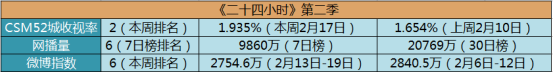 本周五(2月17日),浙江卫视《二十四小时》迎来第二季第三期节目,CSM52城收视率1.935%,较首期相比呈上升趋势。该节目在微博指数方面稍有下滑,本期位于榜单第六位。