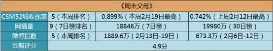 《周末父母》讲述了讲述了“80后”夫妻于致远与赵佳妮作为一对“周末父母”,为能够参与儿子的成长从而坚持自我奋斗并且找到家庭相爱相守真谛的故事。本周,该剧CSM52城收视率于2月19日达到最高值,为0.899%,距离破1差距不大。