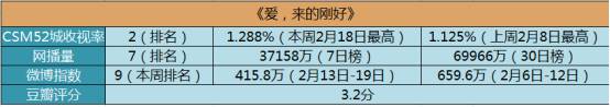 本周(2月13日-19日),由韩栋,江铠同主演的电视剧《爱,来得刚好》一周内CSM52城收视率最高达到1.288%,但豆瓣评分较低为3.2分;《三生三世十里桃花》在收视率、网播量、微博指数三方面表现亮眼,均拔得各榜单头筹;《周末父母》CSM52城最高收视率接近1%,豆瓣评分4.9分。