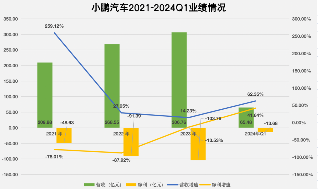 今年一季度,小鹏整业绩表现好于外界预期,但盈利能力仍待加强。一季度,小鹏汽车营收65.5亿元,同比增长62.3%。净亏损13.7亿元,同比收窄41.5%。汽车销售营收55.4亿元,同比增长57.8%。