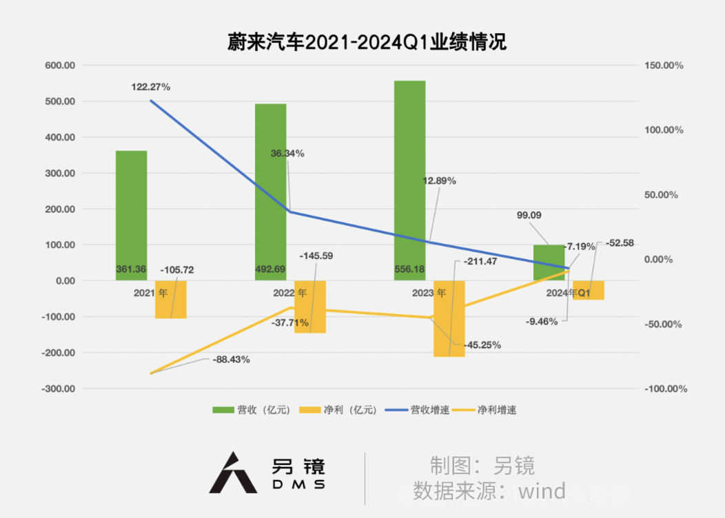 6月6日,蔚来发布一季度财报,业绩整体符合预期。由于处于新旧产品切换期,一季度实现营收99.09亿元,同比下滑7.19%。净亏损51.8亿元,同比扩大9.4%。汽车销售营收83.81亿元,同比下滑9.1%。