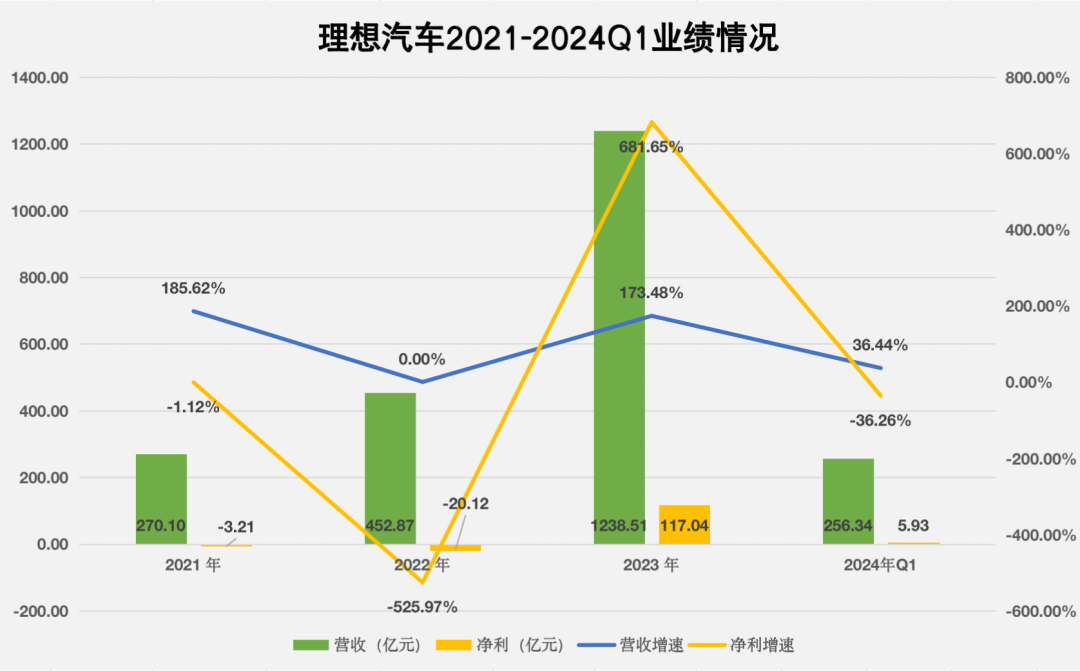 而理想2023年业绩猛增,今年一季度业绩表现,盈利能力依然稳健增长,在市场疲软的大环境下,汽车毛利率仍维持较高水平,同比提升0.2个百分点。一季度,营收243 亿元,同比大增36%,净利润6亿元,同比下滑37%。