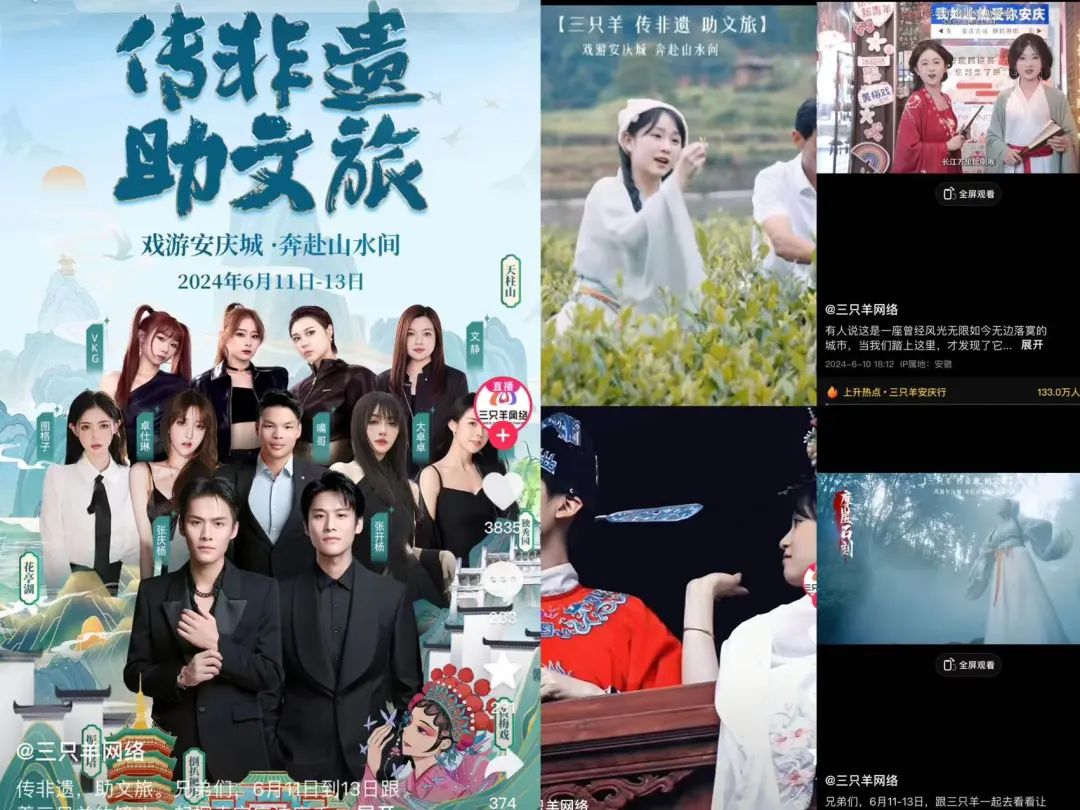 6月11日-6月13日,疯狂小杨哥开启主题为“戏游安庆城,奔赴山水间”的文旅直播活动。三只羊发布的宣传海报打出的宣传语是“传非遗,助文旅”,小杨哥则要做“文化传播者”和“文旅引领者”。