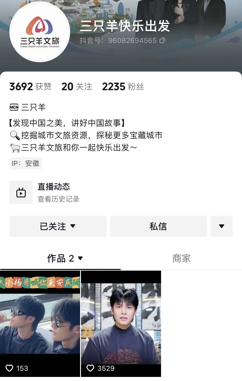 疯狂小杨哥专门开设一个文旅账号——“三只羊快乐出发”,简介为“发现中国之美,讲好中国故事,挖掘城市文旅资源,探秘更多宝藏城市”,足见其对业务的重视,并想在以往的带货模式上,另辟一条道路。不过目前,该账号粉丝不到三千。第一条视频发布于今年6月9日,是一段小杨哥讲述三只羊做文旅的宣传片。