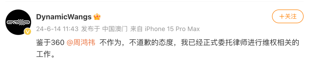 “鉴于360周鸿祎不作为,不道歉的态度,我已经正式委托律师进行维权相关的工作。”6月14日,认证为Dance-focus.com创办人的摄影师在微博继续喊话周鸿祎。