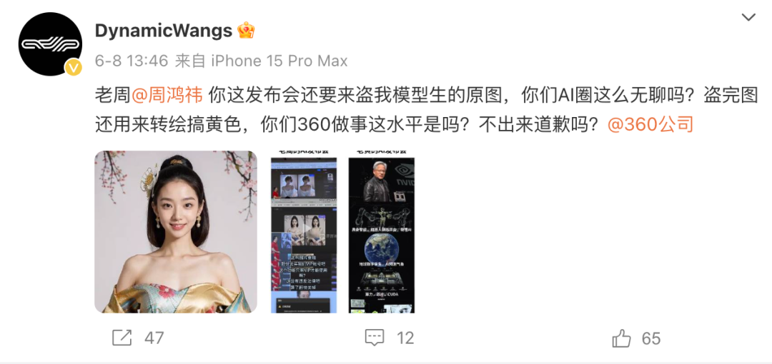 没想到两天后,周鸿祎在发布会上使用的其中一张美女图片也出了问题。6月8日,古装美女图的创作者DynamicWangs喊话周鸿祎和360公司,称“老周你这发布会还要来盗我模型生的原图,你们AI圈这么无聊吗?盗完图还用来转绘搞黄色,你们360做事这水平是吗?不出来道歉吗?”