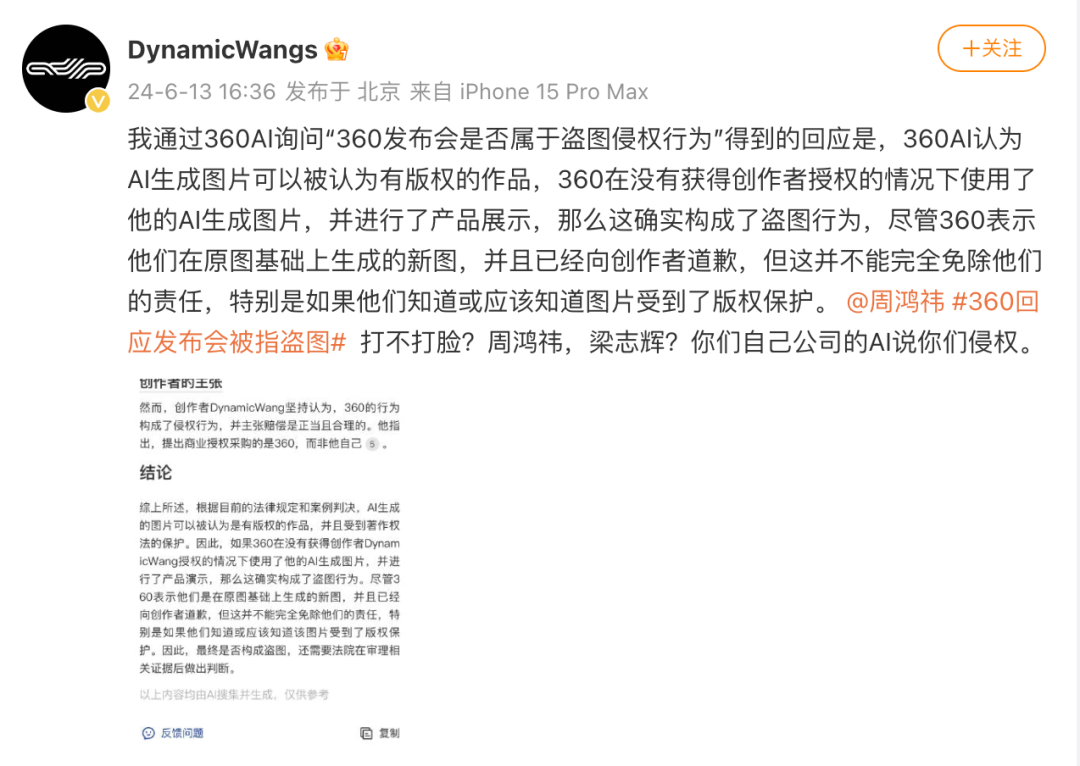 360方面暂未对DynamicWangs的说法进行回复,6月13日,该创作者还发微博,称其通过360AI询问“360发布会是否属于盗图侵权行为”得到的回应是,这确实构成了盗图行为。他又喊话360方面:“打不打脸?周鸿祎,梁志辉?你们自己公司的AI说你们侵权。”