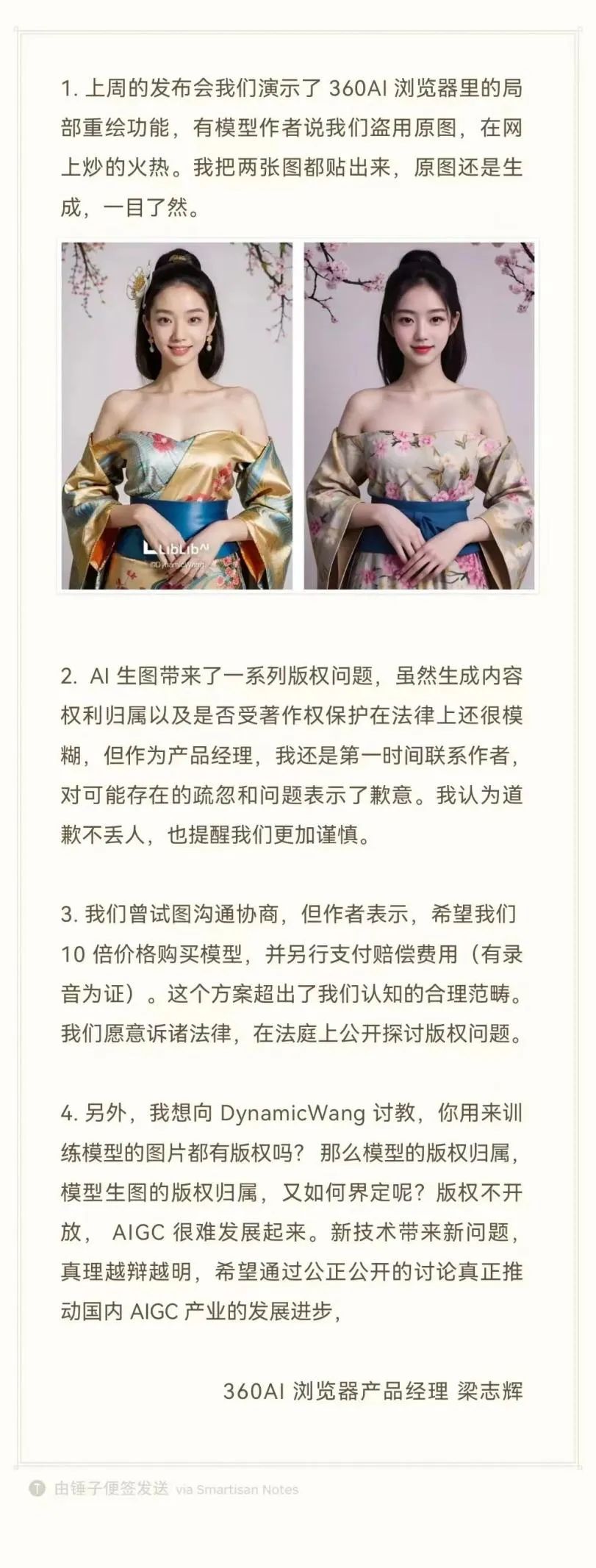 梁志辉还在声明中向DynamicWangs讨教,“你用来训练模型的图片都有版权吗?那么模型的版权归属你用来训练模型的图片都有版权吗?那么模型的版权归属,模型生图的版权归属,又如何界定呢?”