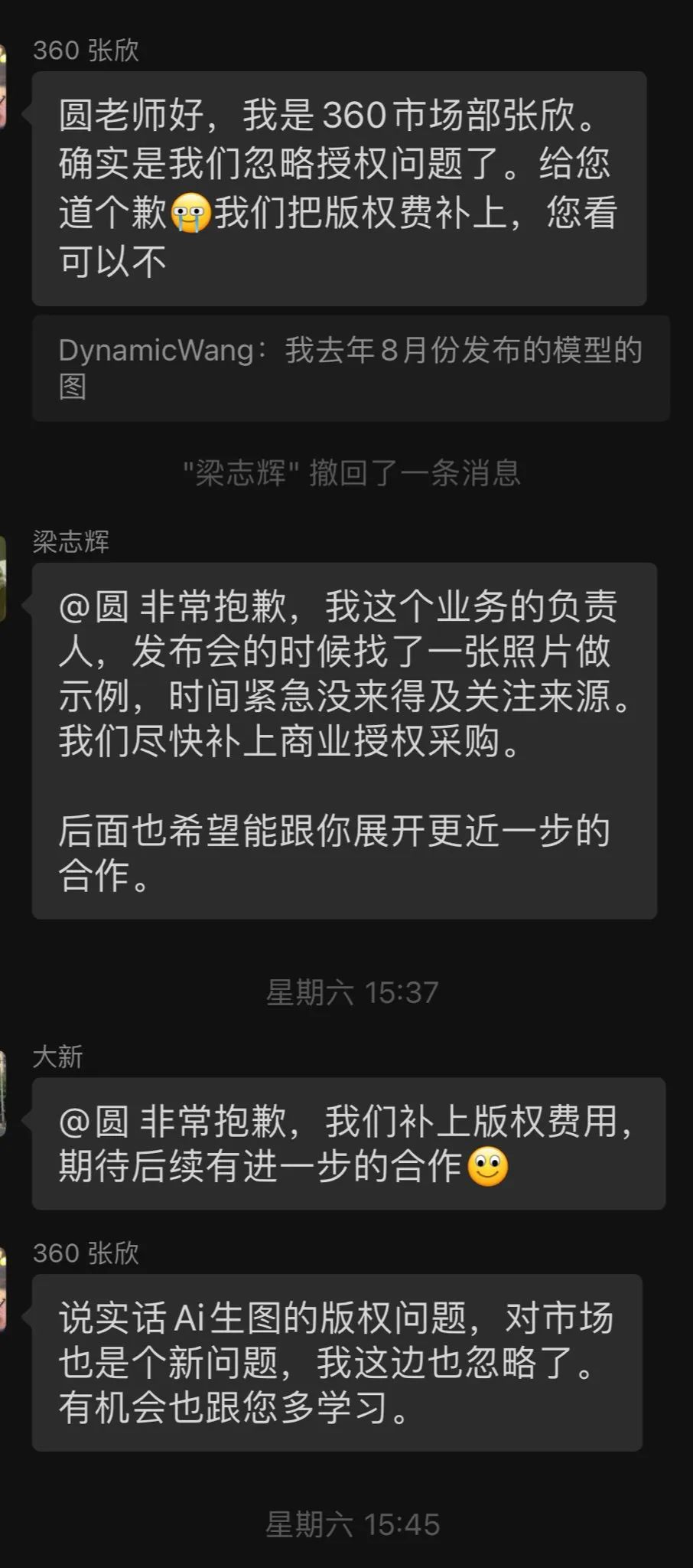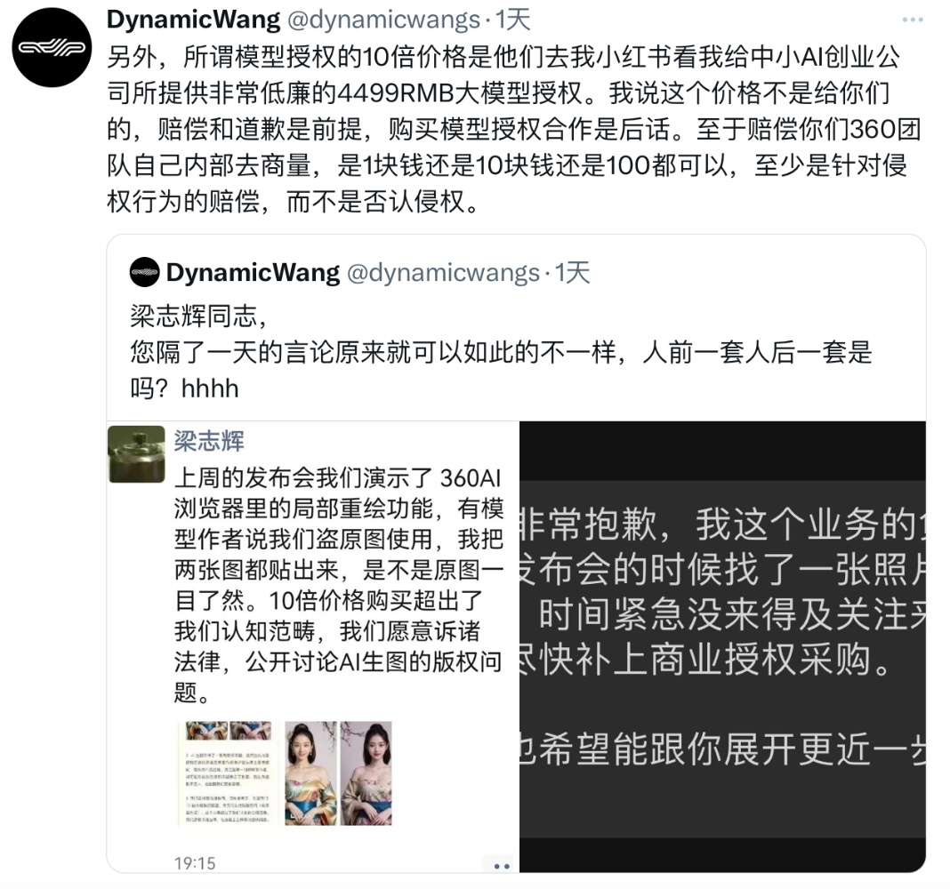 DynamicWangs很快对这一声明作出回应,表示“我说合作是后话,首先要赔偿和承认侵权行为”“所谓模型授权的10倍价格是他们去我小红书看我给中小AI创业公司所提供非常低廉的4499RMB大模型授权。我说这个价格不是给你们的,赔偿和道歉是前提,购买模型授权合作是后话。至于赔偿你们360团队自己内部去商量,是1块钱还是10块钱还是100都可以,至少是针对侵权行为的赔偿,而不是否认侵权。”