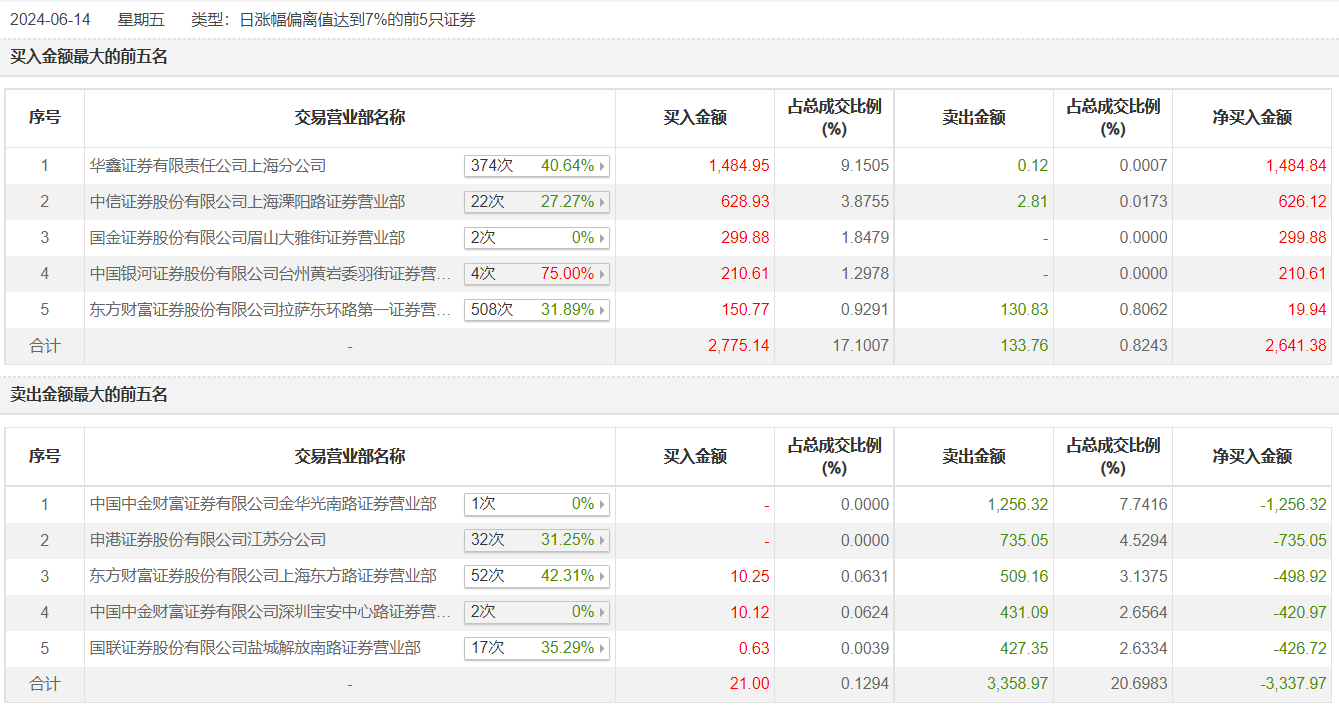 具体来看,知名游资现身龙虎榜,华鑫证券上海分公司、孙哥(中信证券上海溧阳路证券营业部)分别买入1484.95万元、628.93万元;中国中金财富证券有限公司金华光南路证券营业部、申港证券江苏分公司分别卖出1256.32万元、735.05万元。