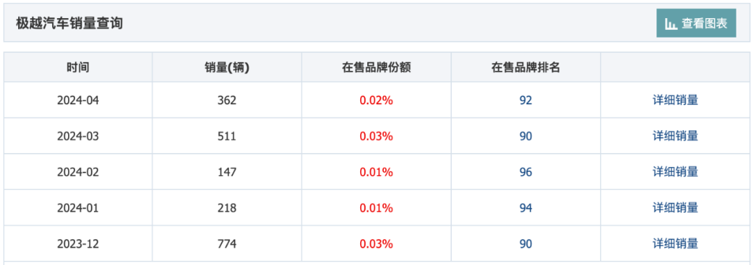 首发一个月后,极越01全系车型在12月降价3万元,起售价格由24.99万元降至21.99万元,并对已提车用户发放3万元补偿。但降价促销并未奏效,据车主之家数据,极越01在随后的5个月中,销量分别为774、218、147、511、362辆。换句话说,截至今年4月,这款新能源汽车半年间总销量不足3000辆。