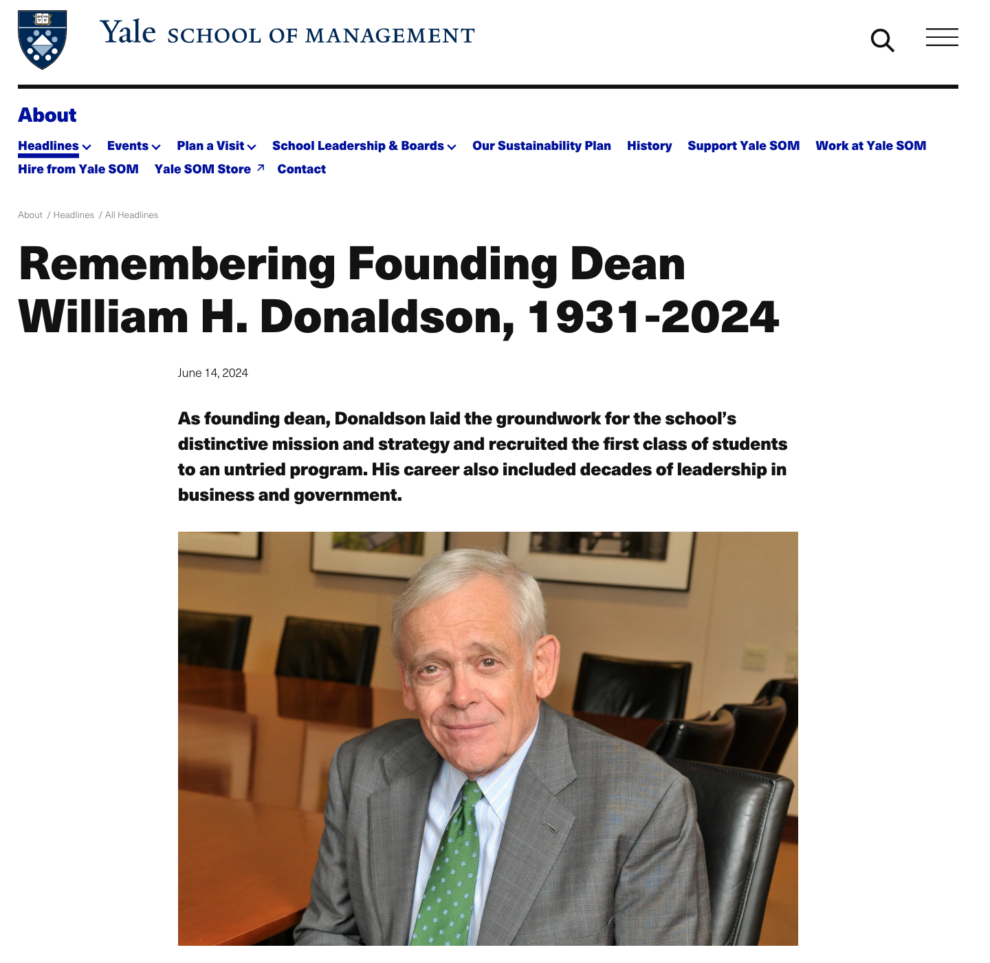 耶鲁大学管理学院发文悼念创始院长威廉·唐纳森(William H. Donaldson)。唐纳森曾担任美国证券交易委员会(SEC)主席,也是华尔街投资银行Donaldson, Lufkin & Jenrette的创始人之一。他于当地时间6月12日去世,享年93岁。