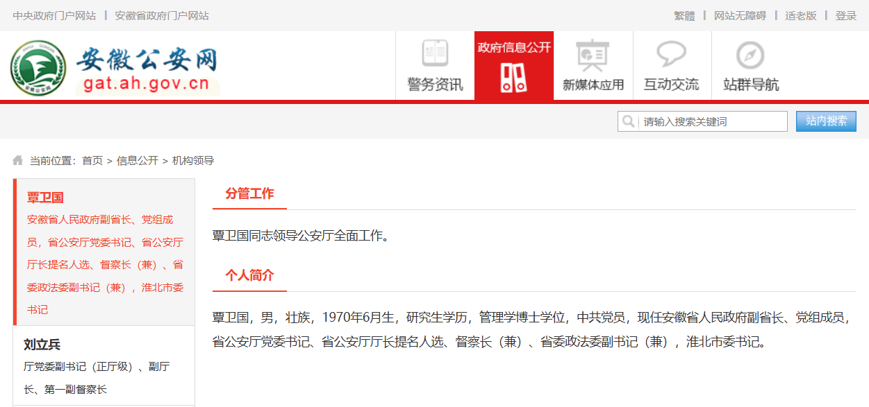 据安徽省公安厅网站“机构领导”一栏6月14日更新显示,覃卫国现任安徽省人民政府副省长、党组成员,省公安厅党委书记、省公安厅厅长提名人选、督察长(兼)、省委政法委副书记(兼),淮北市委书记。领导公安厅全面工作。