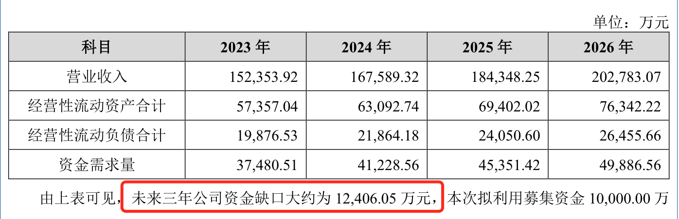 公司也对自己未来的资金缺口做了预测,太湖远大表示,假设未来三年(2023年-2025年)公司将保持年均10%的收入增长速度,且经营性流动资产和经营性流动负债中的各项指标占营业收入比例与2023年保持一致,那么2023年至2026年公司的资金需求量分别为3.75亿元、4.12亿元、4.54亿元、4.99亿元。未来三年公司资金缺口大约为1.24亿元。太湖远大称,本次利用募资1亿元补流,约占资金缺口需求的80.61%,可在一定程度上缓解公司未来的流动资金压力,剩余部分经营性营运资金公司将以自有资金解决。