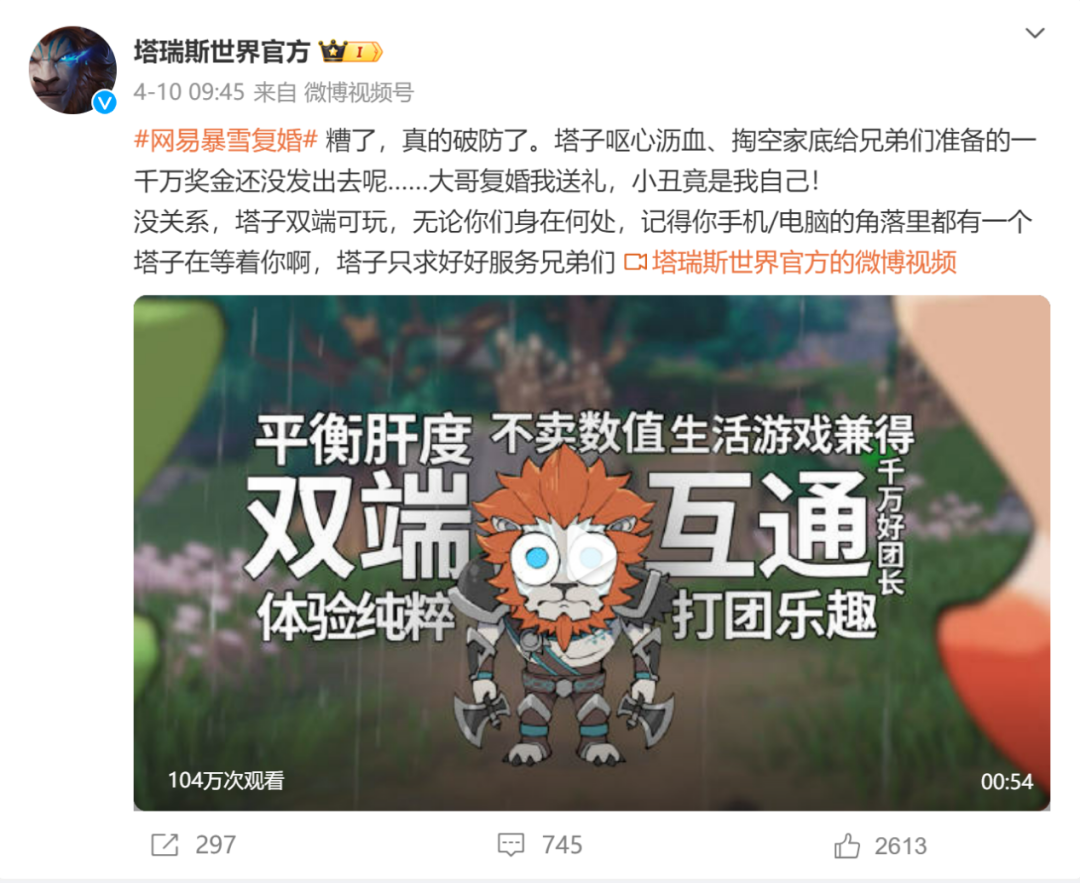 比如今年4月10日,网易与暴雪官宣更新游戏协议,将会把玩家喜爱的游戏带回中国。《塔瑞斯世界》就立刻跟进,在微博上发布了一段小动画,表明制作组呕心沥血、掏空家底给玩家们争取的一千万奖金还没有发出去。“大哥复婚我送礼,小丑竟是我自己!”