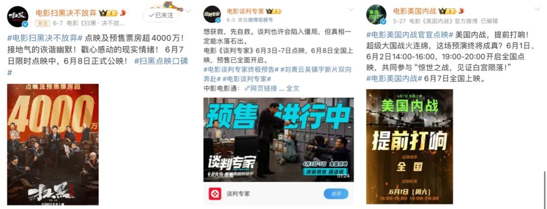 比如此前在《九龙城寨之围城》身上建功的提前点映策略,这次在端午档被大规模学习,《我才不要和你做朋友呢》《扫黑·决不放弃》《谈判专家》均开启了大规模点映,且在档期来临的一周之前就已经开始点映,点映期共收获了2700万-3700万之间的票房。甚至连《美国内战》这样的引进片都开始大举点映,是以往非常少见的情况。