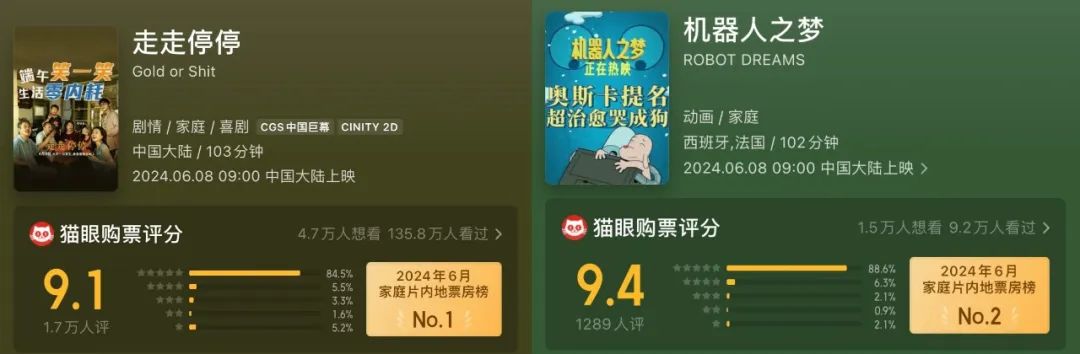 《走走停停》《机器人之梦》评分(图源:猫眼专业版)因此,档期前点映尽管是一种拯救平日票房的积极行为,但的确并不适合所有影片,推广需要看情况。