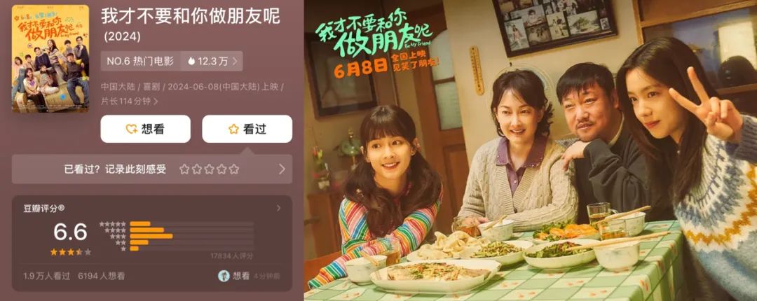 具体来看,拿下票房冠军的是《我才不要和你做朋友呢》,这是一部剧集IP改编电影。毒眸曾在此前的文章中分析过这一现象(点此阅读:《改电影,怎么不香了》),发现这种产品思维从10年代就已经兴起,但在2022年之后有愈发频繁的趋势,基本上所有剧改影项目口碑都低于原作。《我才不要和你做朋友呢》也并不例外,原剧集豆瓣评分8.1,影版目前仅6.6分。影片没有选择像《想见你》《爱很美味》一样将故事设定为剧版的后传,而是选择用除两名主演之外不同的演员班底,重新演绎一遍剧版的剧情。这一产品思路对于路人观众而言或许更加友好,但难免少了一些新鲜感。