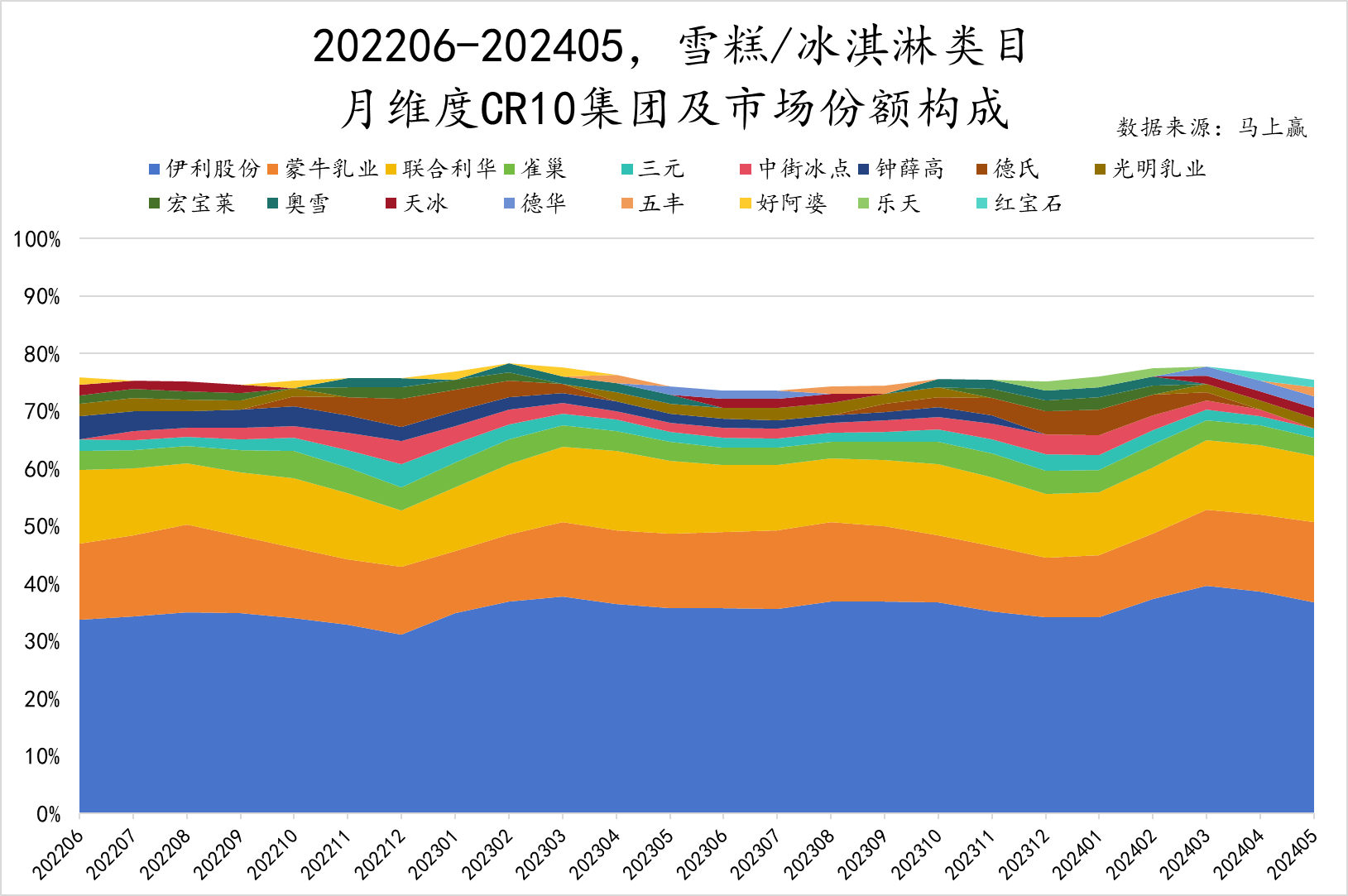 可以看到,在22年-24年三年间4-5月的CR10集团中,22年正值风光无两的钟薛高在当年登榜类目第五名;23年钟薛高跌落至市场份额第七,但依然在榜;而时至24年,钟薛高的名字已经消失在榜单上,难免引人唏嘘。