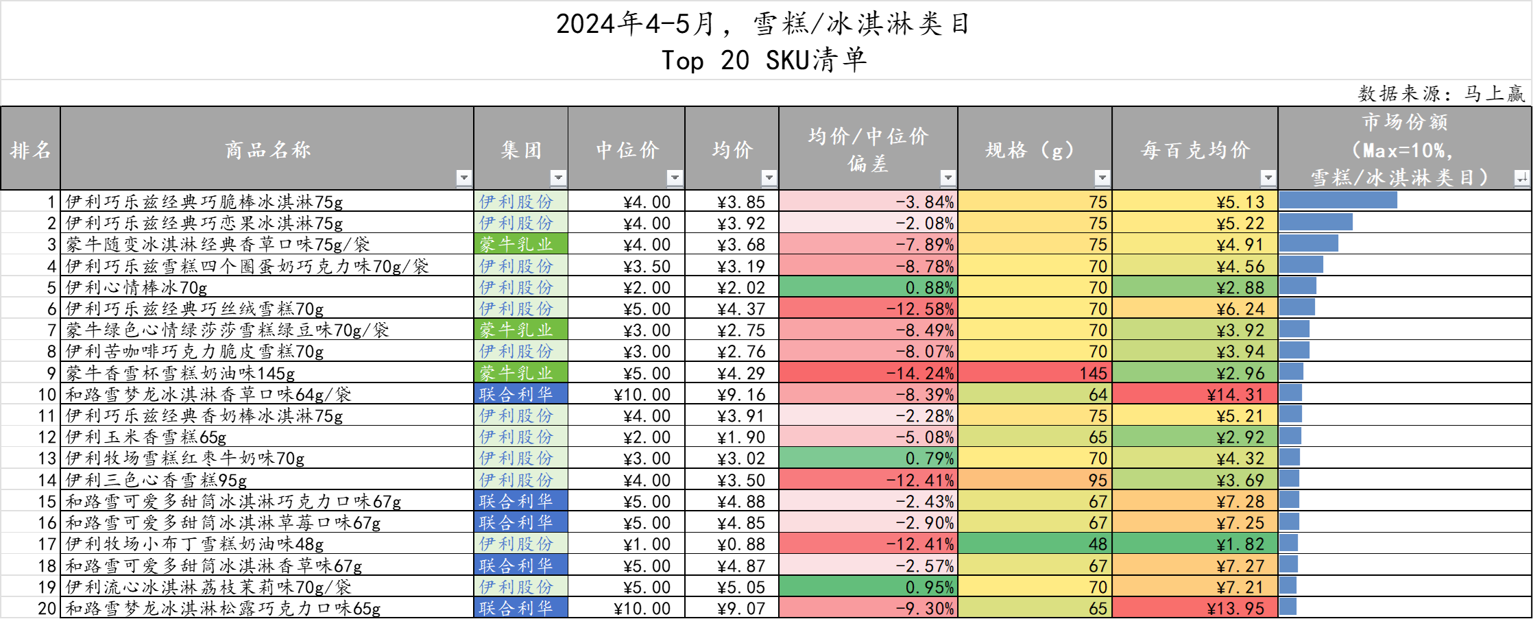 可以看到,TOP20的产品全部由占据大半江山的伊利股份、蒙牛乳业与联合利华这“御三家”包揽。而伊利股份也不愧在CR10集团中位列头名,共有12款产品进入TOP20,并在TOP5中独占四席。来到均价/中位价偏差部分,该数值偏差越大通常意味着促销越多。在TOP20中,均价/中位价偏差最大的是蒙牛香雪杯冰淇淋香草口味,偏差最少的则是伊利牧场雪糕红枣牛奶味,而唯三出现正偏差的产品皆来自伊利股份。
