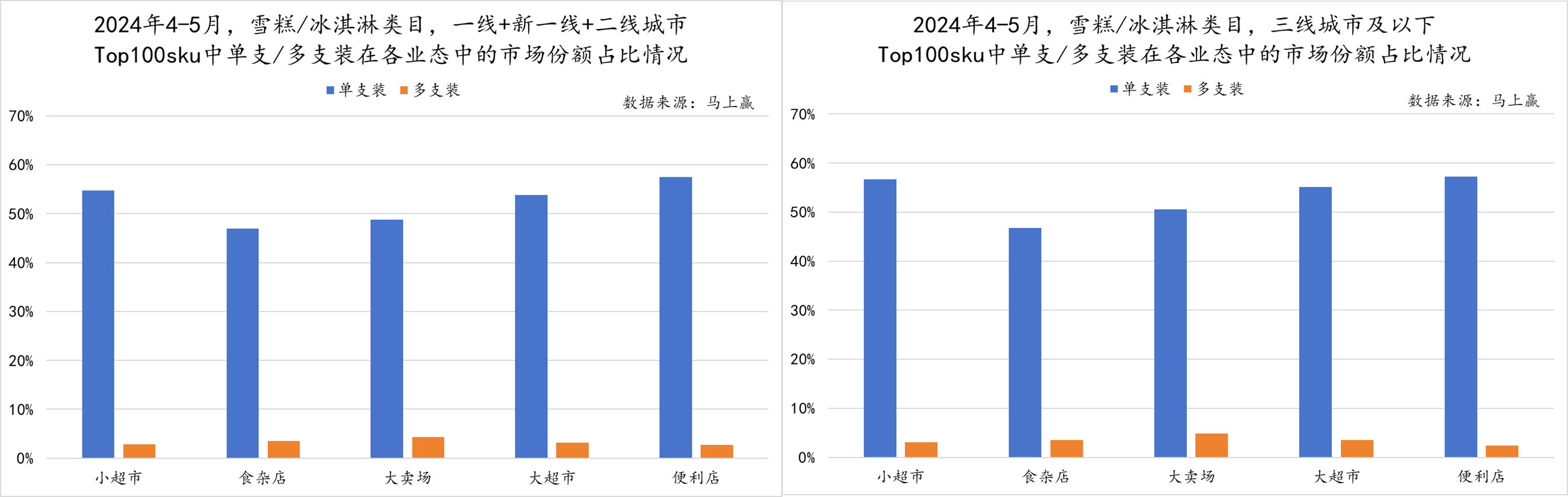 在单支装/多支装类型产品的消费习惯上,城市等级与业态是否会对消费习惯有所影响?回到今年4-5月的TOP100 SKU,我们将城市等级分为一线+新一线+二线、三线城市及以下两部分去观察各业态下单支装/多支装类型产品的市场份额占比情况。