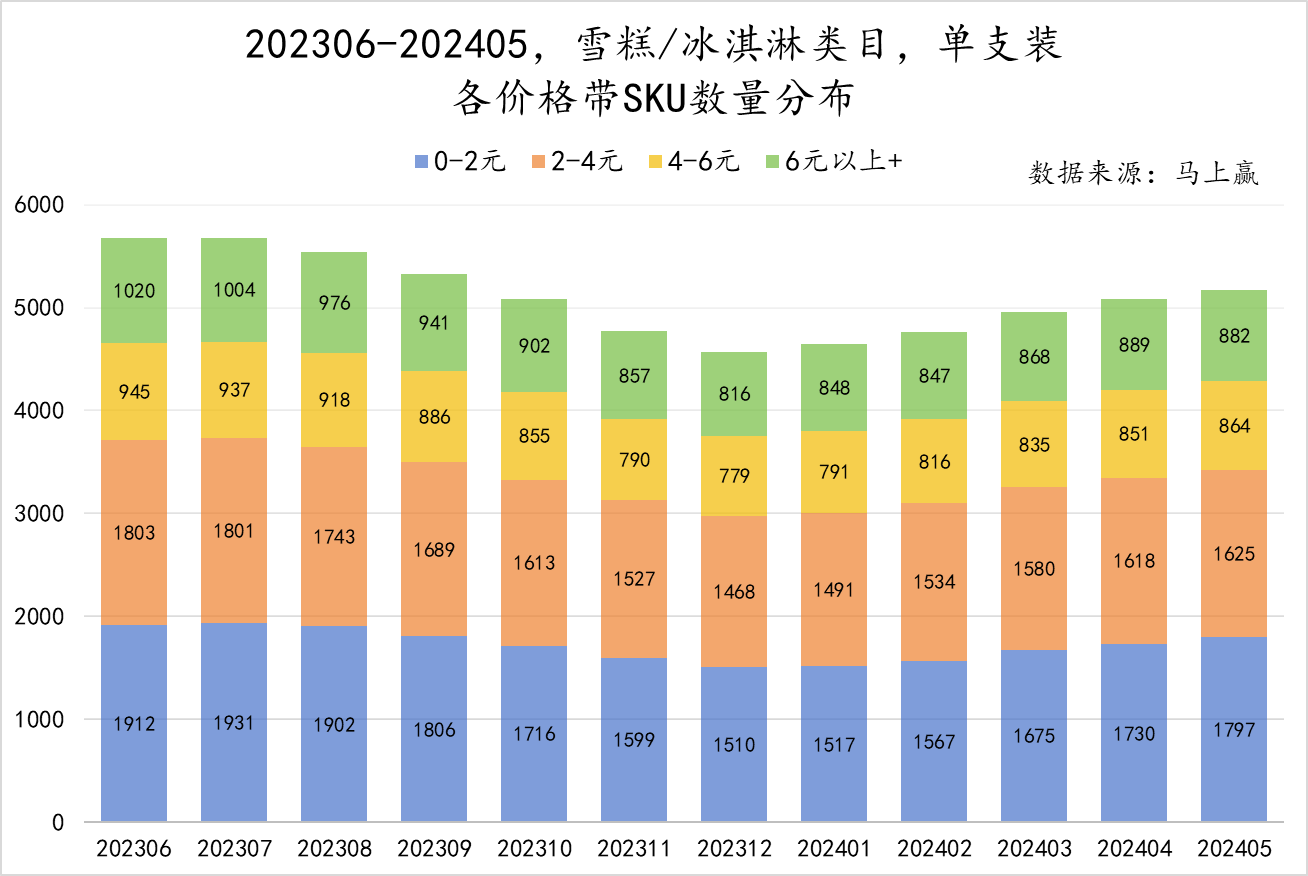 拉长时间段到2023年4月-2024年5月,观察两类产品的SKU数量与市场份额变化的情况,从SKU数量上看,整体上单支装与多支装市场份额变化与类型SKU数量占比变化不大。在作为主流的单支装雪糕冰淇淋之下,多支装逐渐找到了自己在市场中的位置,开始稳中求进。这也向我们解锁了雪糕冰淇淋的另一个应用场景:家庭分享。单支装的雪糕或许适合独自在室外解暑,但多支装雪糕则凭借性价比和便利获得了家庭场景消费者的青睐。