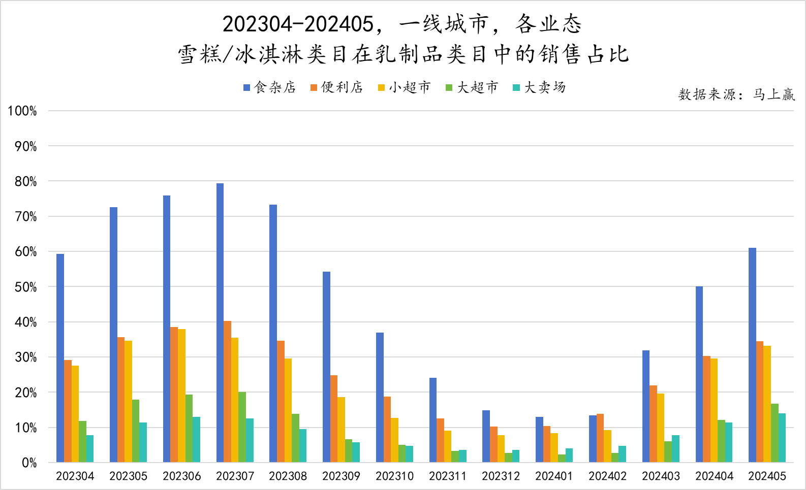 虽然在我们曾经复盘过的Q1线下零售消费情况中,2024年乳制品类目整体表现欠佳。但在类目内部看,雪糕/冰淇淋在今年的类目内占比同比好于去年,消费者在对消暑冰品的选项中,并没有遗忘雪糕/冰淇淋类产品的存在。