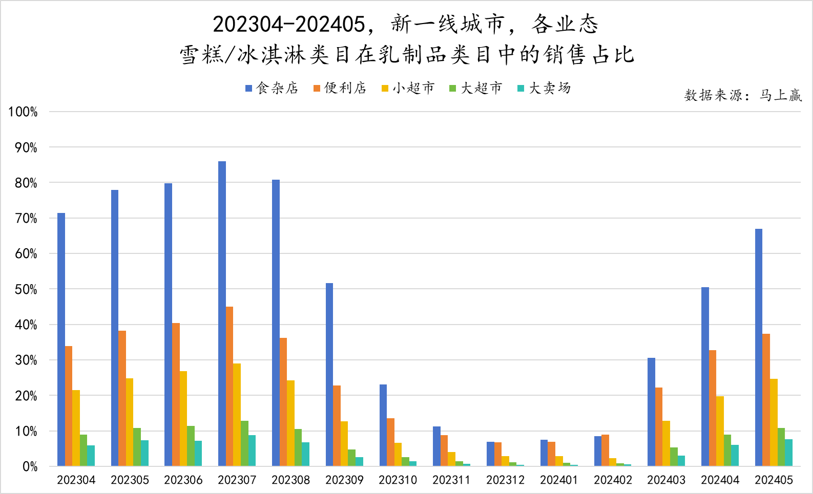 为观察该类目的渠道情况,基于马上赢品牌CT中的数据,我们通过对202304-202405这一时间段内,一线城市、新一线城市、二线城市以及三线城市及以下各城市等级中雪糕冰淇淋类目在乳制品类目中的销售占比,来观察雪糕/冰淇淋这一类目的城市等级、渠道偏好情况。