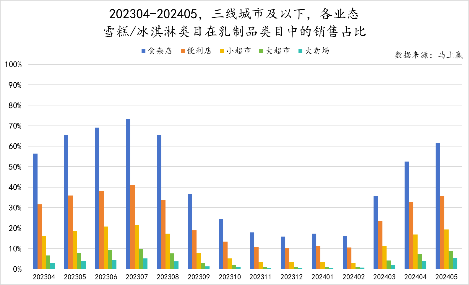 二线城市中,食杂店与一线城市、新一线城市一同占据销售占比首位,但占比额度整体低于前两者。二线城市渠道中便利店与小超市同为雪糕冰淇淋在乳制品类目中销售占比的中流砥柱。大超市与大卖场在旺季能够保有一定销售占比,达到近10%。