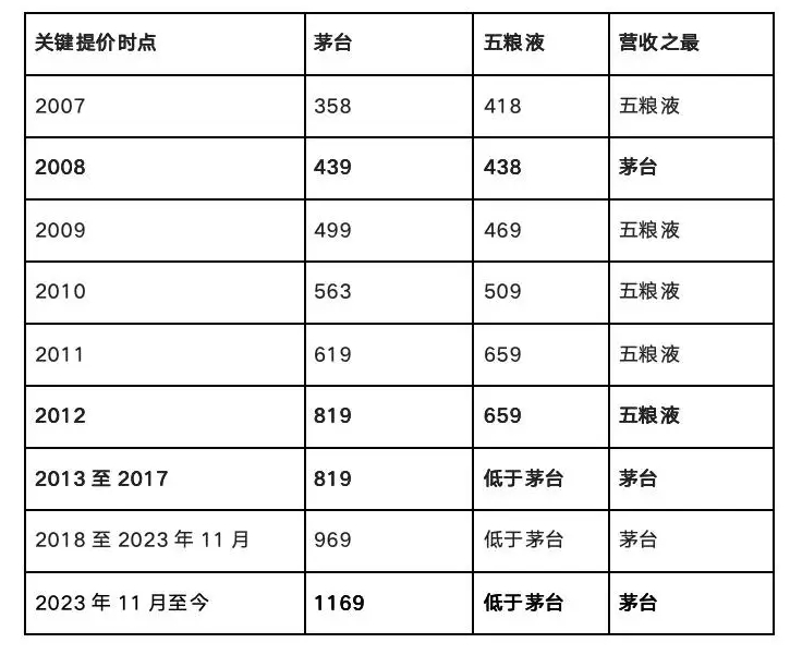 从上图不难看出,2008与2012年两次提价,对茅台反超五粮液至关重要。