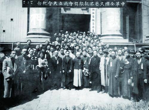 “中国舞台协会”成员与影剧界友人合影。前排左一白杨、左二欧阳予倩,后排左二洪深、左四唐槐秋、左六应云卫